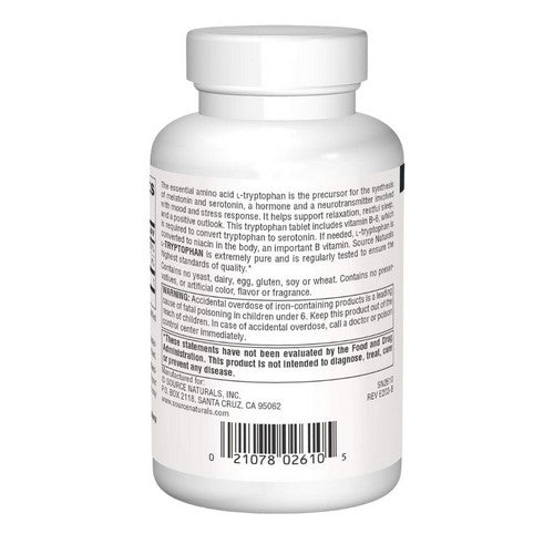 The essential amino acid L-tryptophan is the precursor for the synthesis of melatonin and serotonin, a hormone and a neurotransmitter involved with mood and stress response. It helps support relaxation, restful sleep, and a positive outlook. This tryptophan tablet includes vitamin B-6, which is required to convert tryptophan to serotonin. If needed, L-tryptophan is converted to niacin in the body, an important B vitamin. Source Naturals L-Tryptophan is extremely pure and is regularly tested to ensure the highest standards of quality.*