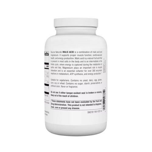 Malic Acid is a combination of malic acid and magnesium. It supports proper muscle function, cardiovascular health, and energy production. Malic acid is a natural fruit acid that is present in most cells in the body and is an intermediate in the Krebs cycle, where energy is captured during the metabolism of carbs and fats. Magnesium plays an important role in muscle relaxation and is an essential cofactor for over 300 enzymatic reactions in metabolism, ATP synthesis, and energy.