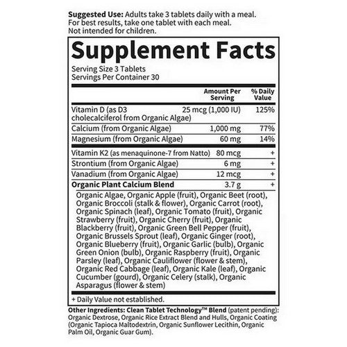 Certified Organic Plant Calcium Blend Organic Algae, Organic Apple (fruit), Organic Beet (root), Organic Broccoli (stalk & flower), Organic Carrot (root), Organic Spinach (leaf), Organic Tomato (fruit), Organic Strawberry (fruit), Organic Cherry (fruit), Organic Blackberry (fruit), Organic Green Bell Pepper (fruit), Organic Brussels Sprout (leaf), Organic Ginger (root), Organic Blueberry (twit), Organic Garlic (bulb), Organic Green Onion (bulb), Organic Raspberry (fruit), Organic Parsley (leaf), Organic Cauliflower (flower & stem), Organic Red Cabbage (leaf), Organic Kale (leaf), Organic Cucumber (gourd), Organic Celery (stalk), Organic Asparagus (flower & stem) |