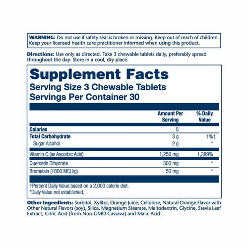 Quercetin is one of the most well-known non-citrus bioflavonoids. Flavonoids help maintain normal capillary permeability. Bromelain is the famous enzyme from pineapple that has been valued for many years. Vitamin C is an important nutrient intended to provide nutritive support for normal, healthy collagen synthesis, development of the cartilage and bone, capillary and blood vessel integrity, health of your skin, and nerve impulse transmission.