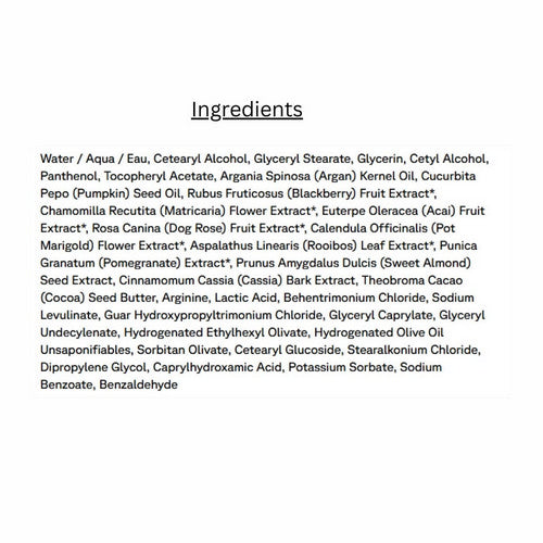 | Ingredients: Aqua (water/eau), cetearyl alcohol, glycerin, stearalkonium chloride, behentrimonium chloride, cetearyl glucoside, glyceryl stearate, sorbitan olivate, argania spinosa (argan) kernel oil*, cucurbita pepo (pumpkin) seed oil, cinnamomum cassia bark oil, prunus amygdalus dulcis (sweet almond) seed extract, theobroma cacao (cocoa) seed butter, guar hydroxypropyltrimonium chloride, arginine, euterpe oleracea (acai) fruit extract*, rubus fruticosus (blackberry) fruit extract*, punica granatum (pomegranate) extract*, rosa canina (rosehip) fruit extract*, calendula officinalis flower extract*, aspalathus linearis (rooibos) leaf extract*, chamomilla recutita (matricaria) flower extract*, benzaldehyde, sodium levulinate, lactic acid, tocopheryl acetate, cetyl alcohol, potassium sorbate. *Organic ingredient. |