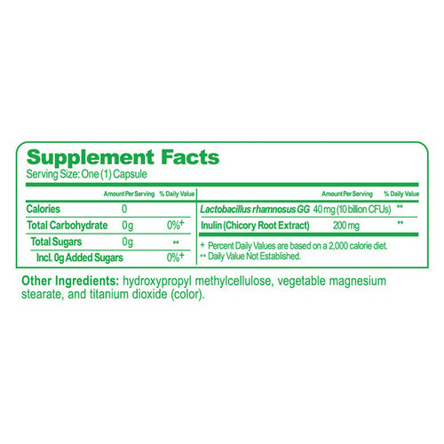 Ingredients: 1 Capsule: Lactobacillus GG 10 Billion Cells (Guaranteed Potency Through Date on Box When Stored According to Instructions); Inulin (Chicory Root Extract) 200 mg; Gelatin (Capsule); Vegetable Magnesium Stearate; Silica; Titanium Dioxide (Color).