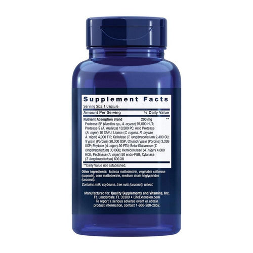 | Nutrient Absorption Blend Protease SP (Bacillus sp., Aspergillus oryzae) 97,000 HUT; Protease S (Aspergillus melleus) 10,500 PC; Acid Protease (Aspergillus niger) 10 SAPU; Lipase (Candida rugosa, Rhizopus oryzae, Aspergillus niger) 4,000 FIP; Cellulase (Trichoderma longibrachiatum) 2,400 CU; Trypsin (Porcine) 20,000 USP; Chymotrypsin (Porcine) 3,336 USP; Phytase (Aspergillus niger) 20 FTU; Beta-Glucanase (Trichoderma longibrachiatum) 30 BGU; Hemicellulase (Aspergillus niger) 4,000 HCU; Pectinase (Aspergillus niger) 50 endo-PGU; Xylanase (Trichoderma longibrachiatum) 600 XU |