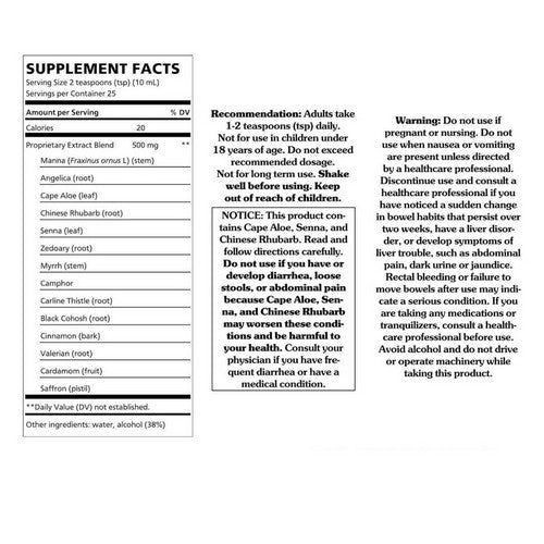 manna, angelica, aloe, senna, rhubarb, zedoary, myrrh, carline thistle, camphor, valerian root, saffron, cardamom, cinnamon, black snakeroot, and water.