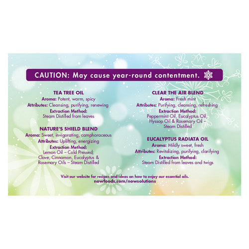 Tea tree, Eucalyptus radiata: For aromatherapy use. For all other uses, carefully dilute with a carrier oil such as jojoba, grapeseed, olive, or almond oil prior to use. Please consult an essential oil book or other professional reference source for suggested dilution ratios.Nature?s shield: Add to a diffuser to purify and cleanse rooms, or create a room mister by adding 10 - 30 drops to 1 oz. of water in a spray bottle. Great blend to promote a healthy environment.Clear the air: Add to a diffuser, or create a purifying room mister by adding 30 drops to 1 oz. of water in a spray bottle. Great for travelers or for seasonal use.