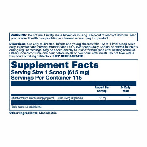 Use only as directed. Infants and young children take 1/2 to 1 level scoop twice daily. Expectant and nursing mothers take 3 to 6 level scoops daily. Should be offered to infants during regular feedings. May be added directly to infant formula (add after heating formula). Others should consume one hour before meals or two hours after meals. Do not take within two hours of taking antibiotics. Keep refrigerated.