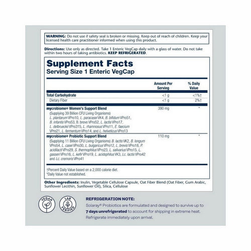 {"id":2590337990741,"title":"Solaray, Women's Formula 50 Billion, 30 Veg Caps","handle":"womens-formula-50-billion-71067","description":"\u003cstrong\u003eProduct Description\u003c\/strong\u003e\u003cbr\u003e\u003cbr\u003e The human microbiome is the collection of living microorganisms in the body. Your microbiome is unique. Trillions of healthy bacteria help you digest food, regulate your mood, assist your immune system, and much more. Maintaining microbiome balance is essential to your health. Your needs are personal. Mycrobiome probiotics are designed for you. \u003cbr\u003e\u003cbr\u003e\u003cstrong\u003eProduct Benefits\u003c\/strong\u003e\u003cbr\u003e\n\t\u003cbr\u003e Dietary Supplement.\nBillion Live Cultures.\nEnteric Shield.\nStrains.\nPrebiotic Inulin.\nVegan. \u003cbr\u003e\u003cbr\u003e\u003cstrong\u003eIngredients\u003c\/strong\u003e\u003cbr\u003e\u003cbr\u003e \u003ctable class=\"tableLabelClass suppFactsTable\" cellpadding=\"0\" cellspacing=\"0\" border=\"1\" bordercolor=\"#000000\" id=\"tableLabel\"\u003e\n\u003ctr\u003e\u003ctd id=\"cellLabelSuppFacts\" class=\"cellLabelBorderClass\" style=\"padding: 5px;\"\u003e\n\u003cspan class=\"labelSupplementFactsText\" id=\"labelSuppFacts\"\u003e\u003cstrong\u003eSupplement Facts\u003c\/strong\u003e\u003c\/span\u003e\u003cbr\u003e\u003cspan id=\"labelServSize\" class=\"labelServingSizeText\"\u003e\u003cspan style=\"float: right\"\u003eServing Size: 1 Enteric VegCap\u003c\/span\u003e\u003c\/span\u003e\u003cbr\u003e\n \u003ctable border=\"1\" bordercolor=\"#000000\" id=\"suppFactsTable\" width=\"100%\" cellpadding=\"0\" cellspacing=\"0\"\u003e\n\u003ctr\u003e\n\u003cth id=\"apsBlank\"\u003e \u003c\/th\u003e\n\u003cth id=\"cellAmtPerServ\" class=\"cellAmtPerServ suppFactsAmtPerServeHdr\"\u003eAmount Per\u003cbr\u003eServing\u003c\/th\u003e\n\u003cth id=\"cdllPdvPerServ\" class=\"cellAmtPerServ suppFactsPerDailyValHdr\"\u003e% Daily\u003cbr\u003eValue\u003c\/th\u003e\n\u003c\/tr\u003e\n\u003ctr\u003e\n\u003ctd class=\"cellIngredName\"\u003eTotal Carbohydrate\u003c\/td\u003e\n\u003ctd class=\"cellAmtPerServVal\"\u003e1 g \u003c\/td\u003e\n\u003ctd class=\"cellAmtPerServVal\" style=\"text-align:right;padding-right:10px;\"\u003e\u0026lt;1% †\u003c\/td\u003e\n\u003c\/tr\u003e\n\u003ctr\u003e\n\u003ctd class=\"cellSubIngredName\"\u003e Dietary Fiber\u003c\/td\u003e\n\u003ctd class=\"cellAmtPerServVal\"\u003e0.5 g \u003c\/td\u003e\n\u003ctd class=\"cellAmtPerServVal\" style=\"text-align:right;padding-right:10px;\"\u003e2% †\u003c\/td\u003e\n\u003c\/tr\u003e\n\u003ctr\u003e\n\u003ctd class=\"cellStdIngredName\" style=\"vertical-align: text-top;\"\u003e\n\u003cb\u003emycrobiome® Women's Support Blend\u003c\/b\u003e (Supplying 39 Billion CFU Living Organisms)\u003cbr\u003e\u003ci\u003eL. plantarum\u003c\/i\u003e VPro10,\u003ci\u003e L. paracasei\u003c\/i\u003e VK4, \u003ci\u003eB. bifidum\u003c\/i\u003e VPro51,\u003cbr\u003e\u003ci\u003eB. infantis\u003c\/i\u003e VPro53, B. breve VPro52, \u003ci\u003eL. lactis\u003c\/i\u003e VPro17,\u003cbr\u003e\u003ci\u003eL. delbrueckii\u003c\/i\u003e VPro315, \u003ci\u003eL. rhamnosus\u003c\/i\u003e VPro11, \u003ci\u003eE. faecium\u003c\/i\u003e\u003cbr\u003eVPro21, \u003ci\u003eL. fermentum\u003c\/i\u003e VPro14, and \u003ci\u003eL. helveticus\u003c\/i\u003e VPro13\u003c\/td\u003e\n\u003ctd class=\"cellAmtPerServVal\" style=\"vertical-align: text-top;\"\u003e390 mg \u003c\/td\u003e\n\u003ctd class=\"cellAmtPerServVal\" style=\"vertical-align: text-top;\"\u003e* \u003c\/td\u003e\n\u003c\/tr\u003e\n\u003ctr style=\"height: 0.1px;\"\u003e\u003ctd colspan=\"3\" style=\"height: 0.1px; background-color: black; color: white; font-size: 0.1px;\"\u003e \u003c\/td\u003e\u003c\/tr\u003e\n\u003ctr\u003e\n\u003ctd class=\"cellStdIngredName\" style=\"vertical-align: text-top;\"\u003e\n\u003cb\u003emycrobiome® Probiotic Support Blend\u003c\/b\u003e (Supplying 11 Billion CFU Living Organisms) \u003ci\u003eB. lactis\u003c\/i\u003e VK2, \u003ci\u003eB. longum\u003c\/i\u003e VPro54, \u003ci\u003eL. casei\u003c\/i\u003e VPro30, \u003ci\u003eL. bulgaricus\u003c\/i\u003e VPro12, \u003ci\u003eL. brevis\u003c\/i\u003e VPro18, \u003ci\u003eP. acidilacti\u003c\/i\u003e VPro29, \u003ci\u003eS. thermophilus\u003c\/i\u003e VPro23, \u003ci\u003eL. salivarius\u003c\/i\u003e VPro15, \u003ci\u003eL. gasseri\u003c\/i\u003e VPro16, \u003ci\u003eL. kefir\u003c\/i\u003e VPro19, \u003ci\u003eL. acidophilus\u003c\/i\u003e VK3, \u003ci\u003eLc. lactis\u003c\/i\u003e VPro42 and \u003ci\u003eLc. cremoris\u003c\/i\u003e VPro41\u003cbr\u003e\n\u003c\/td\u003e\n\u003ctd class=\"cellAmtPerServVal\" style=\"vertical-align: text-top;\"\u003e110 mg \u003c\/td\u003e\n\u003ctd class=\"cellAmtPerServVal\" style=\"vertical-align: text-top;\"\u003e* \u003c\/td\u003e\n\u003c\/tr\u003e\n\u003ctr\u003e\u003ctd colspan=\"3\" style=\"height: 14px;\"\u003e\u003chr color=\"black\" size=\"14px\"\u003e\u003c\/td\u003e\u003c\/tr\u003e\n\u003ctr\u003e\u003ctd class=\"labelFooter\" id=\"labelFooter\" colspan=\"3\"\u003e † Percent Daily Value based on a 2,000 calorie diet.\u003c\/td\u003e\u003c\/tr\u003e\n\u003ctr\u003e\u003ctd class=\"labelFooter\" id=\"labelFooter\" colspan=\"3\" style=\"text-transform:capitalize;\"\u003e* Daily Value not established.\u003c\/td\u003e\u003c\/tr\u003e\n\u003c\/table\u003e\n\u003c\/td\u003e\u003c\/tr\u003e\n\u003ctr\u003e\u003ctd id=\"otherIngred\" style=\"text-transform:capitalize;\"\u003e\n\u003cb\u003eOther Ingredients:\u003c\/b\u003e Inulin, Vegetable Cellulose Capsule, Oat Fiber Blend (Oat Fiber, Gum Arabic, Sunflower Lecithin, Sunflower Oil), Silica, Cellulose\u003c\/td\u003e\u003c\/tr\u003e\n\u003c\/table\u003e\n\t\u003cbr\u003e\u003cbr\u003e\u003cstrong\u003eSuggestions\u003c\/strong\u003e\u003cbr\u003e\u003cbr\u003e Directions: Use only as directed. Take 1 Enteric VegCap daily with a glass of water. Do not take within two hours of taking antibiotics. KEEP REFRIGERATED. \u003cbr\u003e\u003cbr\u003e\u003cstrong\u003eSpeci