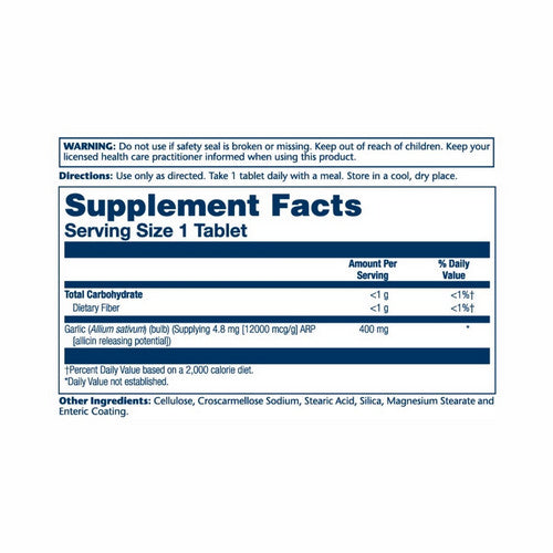 | Garlic (Allium sativum) (bulb) (Supplying 4.8 mg [12000 mcg/g] ARP [allicin releasing potential]) | 400 mg | * |