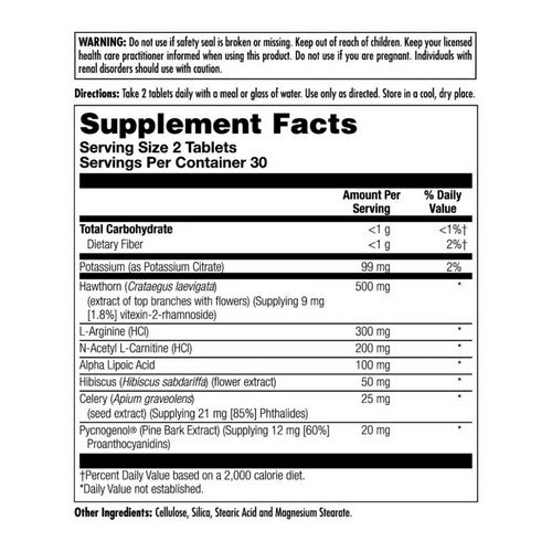 {"id":2590302273621,"title":"Kal, BP Defense, 60 Tabs","handle":"bp-defense-67483","description":"\u003cstrong\u003eProduct Description\u003c\/strong\u003e\u003cbr\u003e\u003cbr\u003e BP Defense is intended to provide nutritive support for arterial health through its unique combination of herbs, antioxidants and essential amino acids. Lifestyles formulas are based on the observation and research of heathcare practitioners and scientists. \u003cbr\u003e\u003cbr\u003e\u003cstrong\u003eProduct Benefits\u003c\/strong\u003e\u003cbr\u003e\n\t\u003cbr\u003e Innovative.\nDietary Supplement.\nArterial Support Formula.\nWith Hawthorn.\nPycnogenol.\nEssential Amino Acids.\nClinical Lifestyles. \u003cbr\u003e\u003cbr\u003e\u003cstrong\u003eIngredients\u003c\/strong\u003e\u003cbr\u003e\u003cbr\u003e \u003ctable class=\"tableLabelClass suppFactsTable\" border=\"1\" bordercolor=\"black\" id=\"tableLabel\"\u003e\n\u003ctr\u003e\u003ctd id=\"cellLabelSuppFacts\" class=\"cellLabelBorderClass\" style=\"padding: 5px;\"\u003e\n\u003cspan id=\"labelSuppFacts\" class=\"labelSupplementFactsText\"\u003eSupplement Facts\u003c\/span\u003e\u003cbr\u003e\u003cspan id=\"labelServSize\" class=\"labelServingSizeText\"\u003e\u003cspan style=\"float: right\"\u003eServing Size: 2 Tablets\u003c\/span\u003e\u003c\/span\u003e\u003cbr\u003e\u003ctable id=\"suppFactsTable\" width=\"100%\" cellpadding=\"0\" border=\"1\" bordercolor=\"black\" cellspacing=\"0\"\u003e\n\u003ctr\u003e\n\u003cth id=\"apsBlank\"\u003e \u003c\/th\u003e\n\u003cth id=\"cellAmtPerServ\" class=\"cellAmtPerServ suppFactsAmtPerServeHdr\"\u003eAmount Per\u003cbr\u003eServing\u003c\/th\u003e\n\u003cth id=\"cdllPdvPerServ\" class=\"cellAmtPerServ suppFactsPerDailyValHdr\"\u003e% Daily\u003cbr\u003eValue\u003c\/th\u003e\n\u003c\/tr\u003e\n\u003ctr\u003e\n\u003ctd class=\"cellIngredName\"\u003eTotal Carbohydrate\u003c\/td\u003e\n\u003ctd class=\"cellAmtPerServVal\"\u003e0.4 g \u003c\/td\u003e\n\u003ctd class=\"cellAmtPerServVal\" style=\"text-align:right;padding-right:10px;\"\u003e\u0026lt;1% \u003c\/td\u003e\n\u003c\/tr\u003e\n\u003ctr\u003e\n\u003ctd class=\"cellSubIngredName\"\u003e Dietary Fiber\u003c\/td\u003e\n\u003ctd class=\"cellAmtPerServVal\"\u003e0.5 g \u003c\/td\u003e\n\u003ctd class=\"cellAmtPerServVal\" style=\"text-align:right;padding-right:10px;\"\u003e2% \u003c\/td\u003e\n\u003c\/tr\u003e\n\u003ctr\u003e\n\u003ctd class=\"cellStdIngredName\" style=\"vertical-align: text-top;\"\u003ePotassium (as Potassium Citrate)\u003c\/td\u003e\n\u003ctd class=\"cellAmtPerServVal\" style=\"vertical-align: text-top;\"\u003e99 mg \u003c\/td\u003e\n\u003ctd class=\"cellAmtPerServVal\" style=\"vertical-align: text-top;\"\u003e3%\u003cspan style=\"margin-right:9px;\"\u003e \u003c\/span\u003e\n\u003c\/td\u003e\n\u003c\/tr\u003e\n\u003ctr\u003e\n\u003ctd class=\"cellStdIngredName\" style=\"vertical-align: text-top;\"\u003eHawthorn (\u003ci\u003eCrataegus laevigata\u003c\/i\u003e) (extract of top branches with flowers) (Supplying 9 mg [1.8%] vitexin-2-rhamnoside)\u003c\/td\u003e\n\u003ctd class=\"cellAmtPerServVal\" style=\"vertical-align: text-top;\"\u003e500 mg \u003c\/td\u003e\n\u003ctd class=\"cellAmtPerServVal\" style=\"vertical-align: text-top;\"\u003e* \u003c\/td\u003e\n\u003c\/tr\u003e\n\u003ctr\u003e\n\u003ctd class=\"cellStdIngredName\" style=\"vertical-align: text-top;\"\u003eL-Arginine (HCI)\u003c\/td\u003e\n\u003ctd class=\"cellAmtPerServVal\" style=\"vertical-align: text-top;\"\u003e300 mg \u003c\/td\u003e\n\u003ctd class=\"cellAmtPerServVal\" style=\"vertical-align: text-top;\"\u003e* \u003c\/td\u003e\n\u003c\/tr\u003e\n\u003ctr\u003e\n\u003ctd class=\"cellStdIngredName\" style=\"vertical-align: text-top;\"\u003eN-Acetyl L-Carnitine (HCI)\u003c\/td\u003e\n\u003ctd class=\"cellAmtPerServVal\" style=\"vertical-align: text-top;\"\u003e200 mg \u003c\/td\u003e\n\u003ctd class=\"cellAmtPerServVal\" style=\"vertical-align: text-top;\"\u003e* \u003c\/td\u003e\n\u003c\/tr\u003e\n\u003ctr\u003e\n\u003ctd class=\"cellStdIngredName\" style=\"vertical-align: text-top;\"\u003eAlpha Lipoic Acid \u003c\/td\u003e\n\u003ctd class=\"cellAmtPerServVal\" style=\"vertical-align: text-top;\"\u003e100 mg \u003c\/td\u003e\n\u003ctd class=\"cellAmtPerServVal\" style=\"vertical-align: text-top;\"\u003e* \u003c\/td\u003e\n\u003c\/tr\u003e\n\u003ctr\u003e\n\u003ctd class=\"cellStdIngredName\" style=\"vertical-align: text-top;\"\u003eHibiscus (\u003ci\u003eHibiscus sabdariffa\u003c\/i\u003e) (flower extract)\u003c\/td\u003e\n\u003ctd class=\"cellAmtPerServVal\" style=\"vertical-align: text-top;\"\u003e50 mg \u003c\/td\u003e\n\u003ctd class=\"cellAmtPerServVal\" style=\"vertical-align: text-top;\"\u003e* \u003c\/td\u003e\n\u003c\/tr\u003e\n\u003ctr\u003e\n\u003ctd class=\"cellStdIngredName\" style=\"vertical-align: text-top;\"\u003eCelery (\u003ci\u003eApium graveolens\u003c\/i\u003e) (seed extract) (Supplying 21 mg [85%] Phthalides)\u003c\/td\u003e\n\u003ctd class=\"cellAmtPerServVal\" style=\"vertical-align: text-top;\"\u003e25 mg \u003c\/td\u003e\n\u003ctd class=\"cellAmtPerServVal\" style=\"vertical-align: text-top;\"\u003e* \u003c\/td\u003e\n\u003c\/tr\u003e\n\u003ctr\u003e\n\u003ctd class=\"cellStdIngredName\" style=\"vertical-align: text-top;\"\u003ePycnogenol (Pine Bark Extract) (Supplying 12 mg [60%] Proanthocyanidins)\u003c\/td\u003e\n\u003ctd class=\"cellAmtPerServVal\" style=\"vertical-align: text-top;\"\u003e20 mg \u003c\/td\u003e\n\u003ctd class=\"cellAmtPerServVal\" style=\"vertical-align: text-top;\"\u003e* \u003c\/td\u003e\n\u003c\/tr\u003e\n\u003ctr\u003e\u003ctd class=\"labelFooter\" id=\"labelFooter\" colspan=\"3\"\u003e Percent Daily Value based on a 2,000 calorie diet.\u003c\/td\u003e\u003c\/tr\u003e\n\u003ctr\u003e\u003ctd class=\"labelFooter\" id=\"labelFooter\" colspan=\"3\" style=\"text-transform:capitalize;\"\u003e* Daily Value not established.\u003c\/td\u003e\u003c\/tr\u003e\n\u003c\/table\u003e\n\u003c\/td\u003e\u003c\/tr\u003e\n\u003ctr\u003e\u003ctd id=
