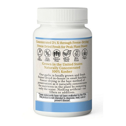 Each 550 mg capsule contains fresh freeze-dried,raw,whole,organic,US grown Garlic bulb (Allium sativum).