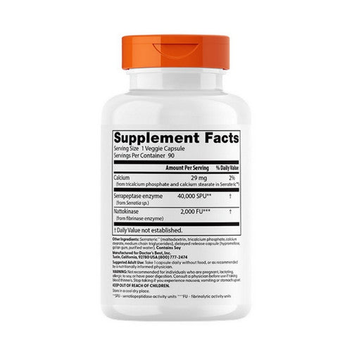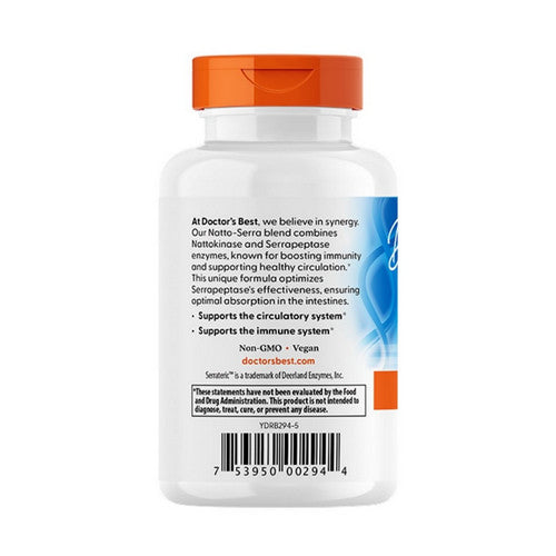 Doctor's Best Natto-Serra is a combination of two natural enzymes serrapeptase and nattokinase, and supports healthy immune response and supports healthy circulation.* Nattokinase, a fibrinolytic enzyme, breaks down blood clotting fibrin while Serrapeptase (serratiopeptidase) is a protein-digesting enzyme isolated from the friendly bacterium Serratia E-15.