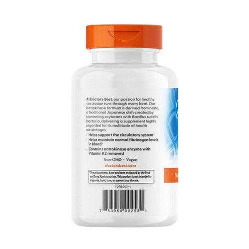 Doctor's Best Nattokinase is a fibrinolytic enzyme derived from "natto", a traditional Japanese food. During the natto production process friendly Bacillus subtilis bacteria ferment boiled, non-GMO soybeans producing nattokinase. Doctor's Best Nattokinase has the vitamin K removed because vitamin K assists in blood coagulation.