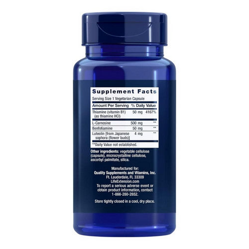 ,Serving Size: 1 Vegetarian Capsule,Amount Per Serving,Thiamine (vitamin B1) (as thiamine HCL) 50 mg,L-Carnosine 500 mg,Benfotiamine 50 mg,Luteolin [from organe extract (fruit)] 4 mg