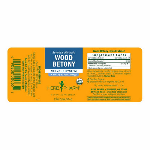 Certified organic grain alcohol distilled water, vegetable glycerine, & Wood Betony extractives.