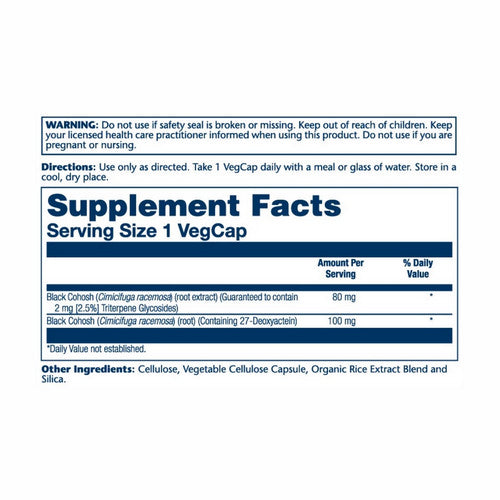 Black Cohosh has a rich tradition in Native American. Black cohosh is known as a female tonic. It is a phytoestrogen-containing herb popular among women and is intended provide nutritive support during natural mid-life changes. Black cohosh has received official recognition in Britain and Germany for its many uses. This product is standardized for its key compounds, including 27-deoxyactein.
