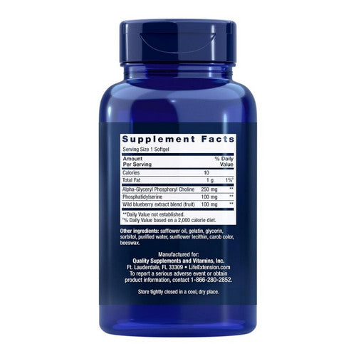 Supplement Facts,Serving Size: 2 softgels,Amount per serving,Calories 10,Calories from Fat 5,Total Fat 1 g,Alpha-Glyceryl Phosphoryl Choline 250 mg,Aurora Blue Wildcrafted blueberry complex,[Alaska blueberry (Vaccinium alaskaense How.),Oval-leaf blueberry (Vaccinium ovalifolium Sm.),Alpine blueberry (Vaccinium uliginosum L.),Dwarf bilberry (Vaccinium cespitosum Michx)],(fruit,leaf,stem) 100 mg,Phosphatidylserine 100 mg,Other Ingredients: Safflower oil,gelatin,glycerin,sunflower lecithin,purified water,sorbitol,carob color,yellow beeswax,silica,maltodextrin.