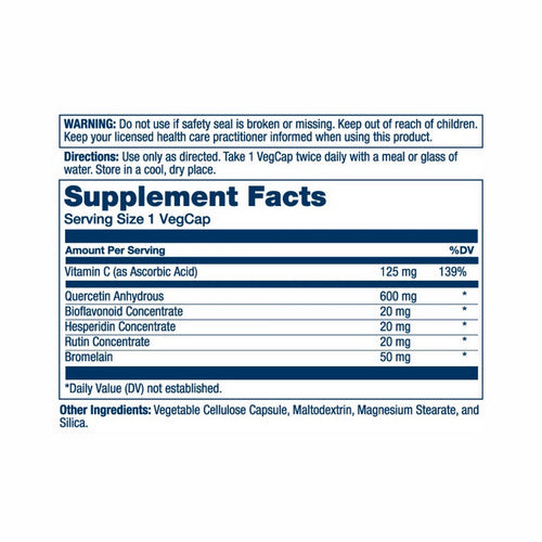 Vitamin C (as Ascorbic Acid) 125 mg 208%,Quercetin Dihydrate 600 mg *,Bioflavonoid Concentrate 20 mg *,Hesperidin Concentrate 20 mg *,Rutin Concentrate 20 mg *,Bromelain 50 mg *,* Daily Value not established.,Other Ingredients: Vegetable Cellulose Capsule,Maltodextrin (from Non-GMO Corn),Magnesium Stearate and Silica
