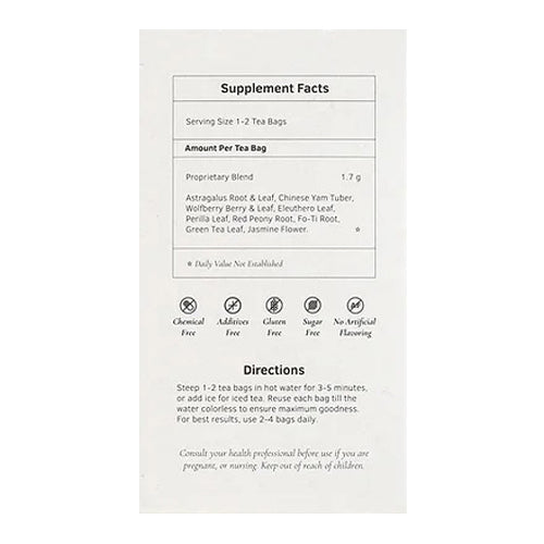 Astragalus (root, leaf & flower), Red peony (root), Fo-ti (root), Chinese yam (tuber), Wolfberry (leaf), Green tea (leaf), Jasmine (flower)