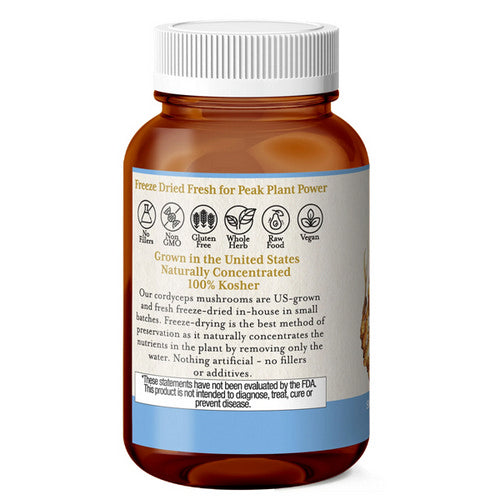 Ingredients: Each 560 mg capsule contains organic, freeze-dried Cordyceps mycelia on rice substrate (Bionectria ochroleuca).