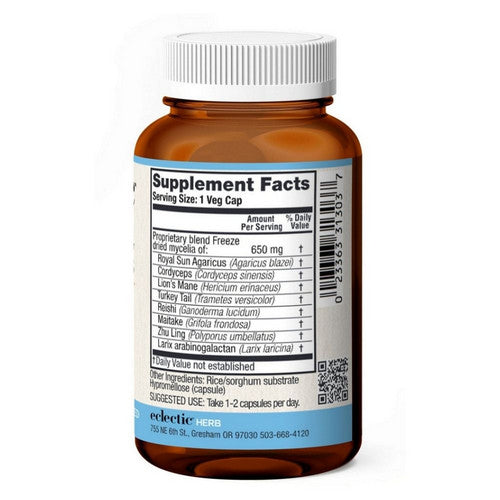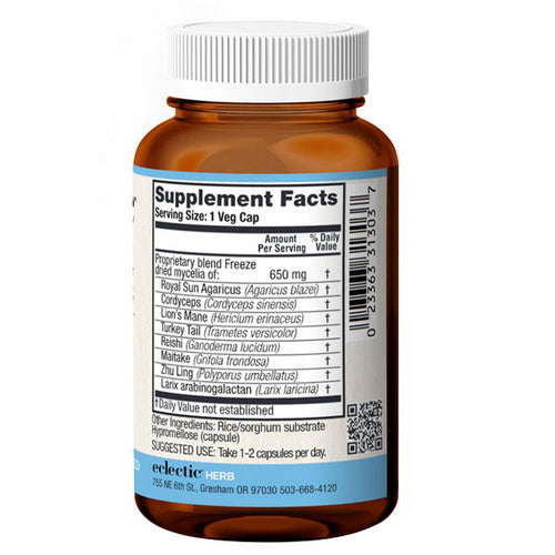 | Ingredients: Each 650 mg capsule contains a Propietary blend of freeze-dried mycelia of: Royal Sun Agaricus (Agaricus blezei) Cordyceps (Bionectria ochrolevca), Lion's Mane (Hericium erinaceus), Turkey Tail (Trametes versicolor), Reishi (Ganoderma lucidium), Maitake (Grifola frondosa), Zhu Ling (Polyporus umbellatus) and Air-dried fruiting body of: Reishi (Ganoderma lucidium), Maitake (Grifola frondosa), Larix (Larix laricina) |