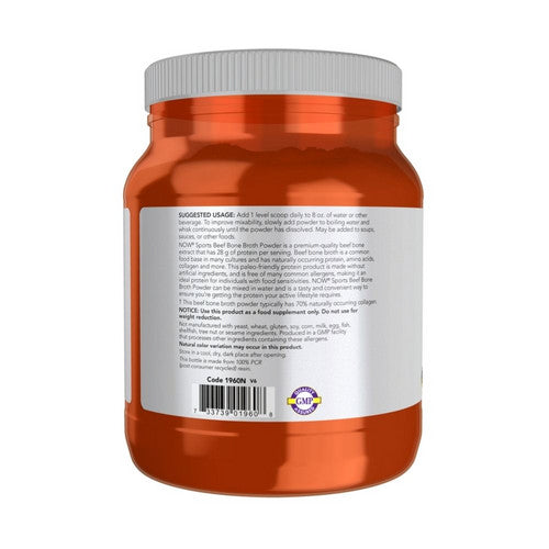 Now Sports Beef Bone Broth Powder is a premium quality beef bone extract that?s an excellent source of natural protein. Beef bone broth is a common food base in many cultures and a natural source of protein, amino acids, collagen and more. Now Sports Beef Bone Broth Powder mixes easily in water and is a tasty and convenient way to ensure you're getting the protein your active lifestyle requires.