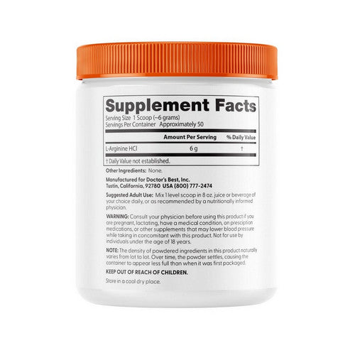 Doctor's Best L-Arginine Powder helps support athletic endurance and helps boost nitric oxide production. L-Arginine is a necessary precursor to creatine which helps supply energy to all of the cells of the body. L-Arginine also helps regulate blood pressure, helps improve cardiovascular health, helps support a healthy immune system, helps improve blood sugar regulation, and helps support brain health. This Doctor's Best item contains no added colors, flavors, fillers, additives or unnecessary ingredients.