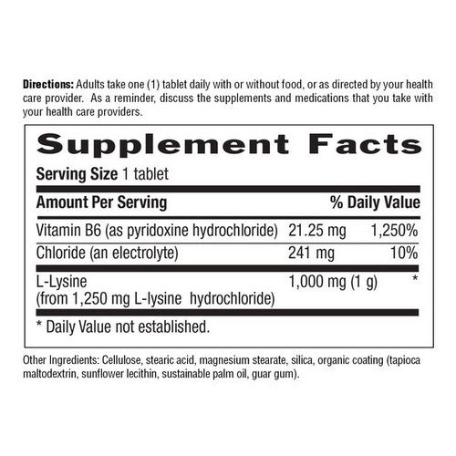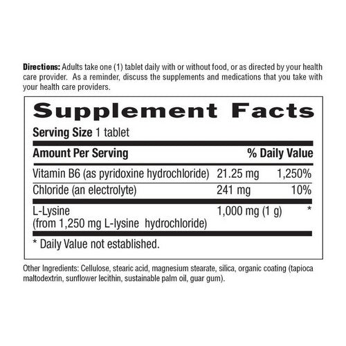 L-lysine is an essential amino acid that body does not make on its own and is difficult to through diet alone. It supports the structure and function of found in skin tissue and is also essential to its renewal, particularly in the lips and mouth region. **It plays a role in collagen formation, along with its function in supporting the immune system. **Includes vitamin B6 in this formula to support the bodys utilization of lysine.**