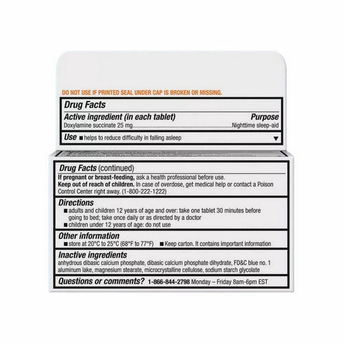 Ask a doctor before use if you have: a breathing problem such as asthma, emphysema or chronic bronchitis; glaucoma; trouble urinating due to an enlarged prostate gland. Ask a doctor or pharmacist before use if you are taking any other drugs. When using this product: avoid alcoholic beverages; take only at bedtime. Stop use and ask a doctor if: side effects occur. sleeplessness persists continuously for more than two weeks. Insomnia may be a symptom of serious underlying medical illness. If pregnant or breast-feeding, ask a health professional before use. Keep out of reach of children. In case of overdose, get medical help or contact a Poison Control Center right away.