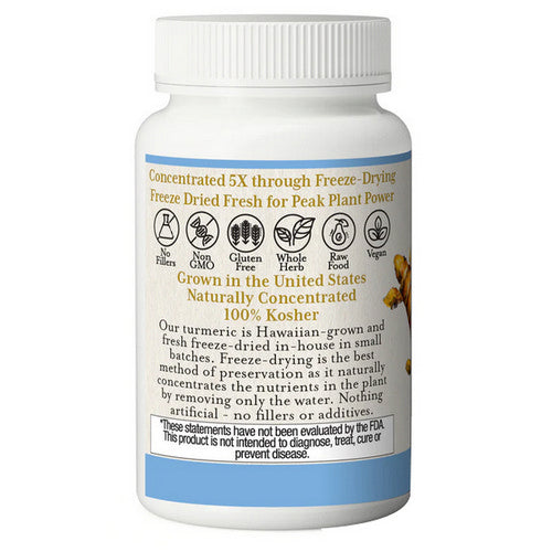 Ingredients: Each 395 mg capsule contains fresh freeze-dried, raw, organic, US grown Turmeric root (Curcuma longa).