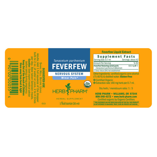 Feverfew extract is from the aerial parts of organic tanacetum parthenium plants grown on farms in southern oregon. The plants are harvested only while flowering, shade dried to retain their full color and aroma, then thoroughly extracted.