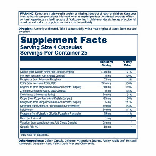 Solaray's Mega Multi Mineral gives you 15 essential minerals that support tissues and processes throughout the body. This product provides you will your daily requirement of calcium, iron and magnesium, which support bone and circulatory health. This formula also contains an herb blend, including parsley, alfalfa, dandelion and chamomile for better absorption with less digestive irritation.