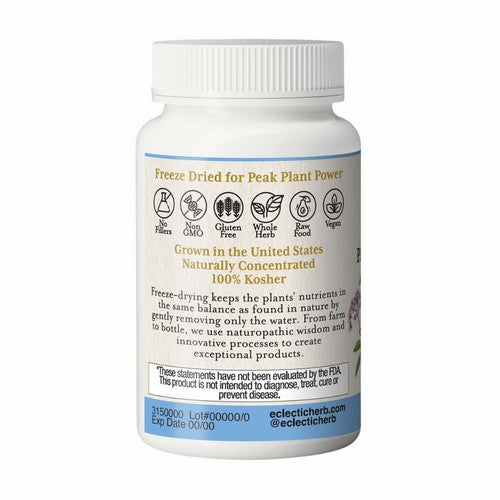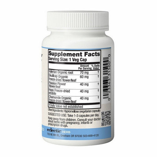 | Ingredients: Each 250 mg capsule contains fresh freeze-dried Valerian (Valeriana sitchensis) root, Skullcap (Scuttlaria lateriflora) flower and leaf, Passion Flower (Passiflora spp.) flower and leaf, Hops (Humulus lupulus) strobile, Chamomile (Matricaria chamomolla) flower. |