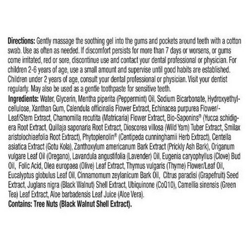 Gently massage the soothing gel into the gums and pockets around teeth with a cotton swab. Use as often as needed. If discomfort persists for more than 7 days or worsens, or gums become irritated, red or sore, discontinue use and contact your dental professional or physician. For children 2-6 years of age, use a small amount and supervise until good habits are established. Children under 2 years of age, consult your dental professional or physician. Visit your dentist regularly.