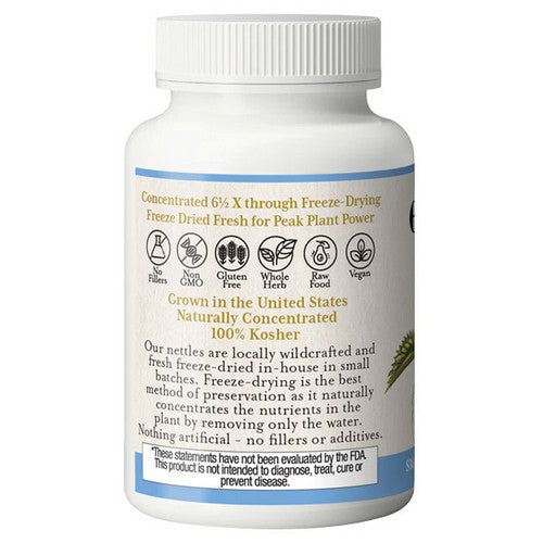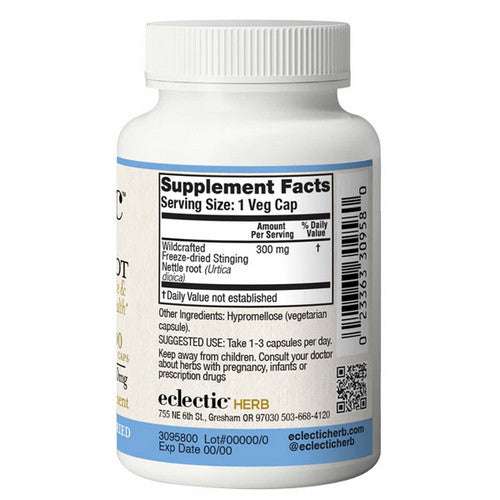 | Ingredients: Each 300 mg capsule contains fresh freeze-dried, raw, wildcrafted, US grown Nettle root (Urtica dioica). |