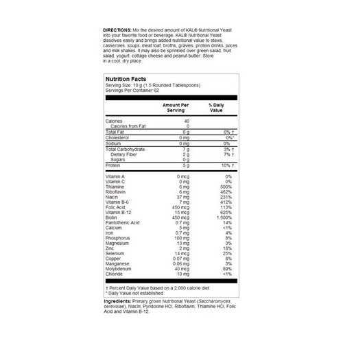 {"id":2588371812437,"title":"Kal, Nutritional Yeast Flakes, 12 oz","handle":"nutritional-yeast-flakes-64849","description":"\u003cstrong\u003eProduct Description\u003c\/strong\u003e\u003cbr\u003e\u003cbr\u003e \u003cul\u003e\n\u003cli\u003eFortified, Premium Unsweetened\u003c\/li\u003e\n\u003cli\u003eGluten Free, Vegan\u003c\/li\u003e\n\u003cli\u003eWonderful Nutty Flavor\u003c\/li\u003e\n\u003cli\u003eNon-GMO\u003c\/li\u003e\n\u003c\/ul\u003e\n \u003cbr\u003e\u003cbr\u003e\u003cstrong\u003eProduct Benefits\u003c\/strong\u003e\u003cbr\u003e\n\t\u003cbr\u003e Nutritional Yeast Flakes are a primary grown product, grown on molasses, for a nutty, roasted flavor that isn?t bitter like traditional yeast products. This product contains no artificial sweeteners or genetically modified organisms. Low in fat and sodium with added B vitamins, mixing in some yeast flakes can help you meet your nutrition goals. \u003cbr\u003e\u003cbr\u003e\u003cstrong\u003eIngredients\u003c\/strong\u003e\u003cbr\u003e\u003cbr\u003e \u003cdiv class=\"prodSupCls\"\u003e\n\u003ctable width=\"100%\" border=\"1\" cellspacing=\"0\" cellpadding=\"3\"\u003e\n\u003ctr\u003e\n \u003ctd colspan=\"3\"\u003e\n\u003cp\u003e\u003cstrong style=\"font-size:16px;\"\u003eSupplement Facts\u003c\/strong\u003e\u003cstrong\u003e\u003cspan style=\"float: right\"\u003eServing Size: \n 10 g (1.5 Rounded Tablespoons)\u003c\/span\u003e\u003c\/strong\u003e\u003c\/p\u003e\n \u003cp\u003e \u003c\/p\u003e\n\u003c\/td\u003e\n\u003c\/tr\u003e\n \u003ctr\u003e\n \u003ctd width=\"49%\" style=\"height: 27px\"\u003e\u003c\/td\u003e\n \u003ctd width=\"24%\" style=\"height: 27px\"\u003e\u003cstrong\u003eAmount Per Serving \u003c\/strong\u003e\u003c\/td\u003e\n \u003ctd width=\"27%\" style=\"height: 27px\"\u003e\u003cstrong\u003e% Daily Value\u003c\/strong\u003e\u003c\/td\u003e\n \u003c\/tr\u003e\n \u003ctr\u003e\n \u003ctd style=\"height: 27px\"\u003eCalories\u003c\/td\u003e\n \u003ctd style=\"height: 27px\"\u003e40\u003c\/td\u003e\n \u003ctd style=\"height: 27px\"\u003e \u003c\/td\u003e\n \u003c\/tr\u003e\n \u003ctr\u003e\n \u003ctd style=\"height: 27px\"\u003eCalories from Fat\u003c\/td\u003e\n \u003ctd style=\"height: 27px\"\u003e0\u003c\/td\u003e\n \u003ctd style=\"height: 27px\"\u003e \u003c\/td\u003e\n \u003c\/tr\u003e\n \u003ctr\u003e\n \u003ctd style=\"height: 27px\"\u003eTotal Fat\u003c\/td\u003e\n \u003ctd style=\"height: 27px\"\u003e0 g\u003c\/td\u003e\n \u003ctd style=\"height: 27px\"\u003e0% †\u003c\/td\u003e\n \u003c\/tr\u003e\n \u003ctr\u003e\n \u003ctd style=\"height: 27px\"\u003eCholesterol\u003c\/td\u003e\n \u003ctd style=\"height: 27px\"\u003e0 mg\u003c\/td\u003e\n \u003ctd style=\"height: 27px\"\u003e0%*\u003c\/td\u003e\n \u003c\/tr\u003e\n \u003ctr\u003e\n \u003ctd style=\"height: 27px\"\u003eSodium\u003c\/td\u003e\n \u003ctd style=\"height: 27px\"\u003e0 mg\u003c\/td\u003e\n \u003ctd style=\"height: 27px\"\u003e0%\u003c\/td\u003e\n \u003c\/tr\u003e\n \u003ctr\u003e\n \u003ctd style=\"height: 27px\"\u003eTotal Carbohydrate\u003c\/td\u003e\n \u003ctd style=\"height: 27px\"\u003e7 g\u003c\/td\u003e\n \u003ctd style=\"height: 27px\"\u003e3% †\u003c\/td\u003e\n \u003c\/tr\u003e\n \u003ctr\u003e\n \u003ctd style=\"height: 27px\"\u003eDietary Fiber\u003c\/td\u003e\n \u003ctd style=\"height: 27px\"\u003e2 g\u003c\/td\u003e\n \u003ctd style=\"height: 27px\"\u003e7% †\u003c\/td\u003e\n \u003c\/tr\u003e\n \u003ctr\u003e\n \u003ctd style=\"height: 27px\"\u003eSugars\u003c\/td\u003e\n \u003ctd style=\"height: 27px\"\u003e0 g\u003c\/td\u003e\n \u003ctd style=\"height: 27px\"\u003e \u003c\/td\u003e\n \u003c\/tr\u003e\n \u003ctr\u003e\n \u003ctd style=\"height: 27px\"\u003eProtein\u003c\/td\u003e\n \u003ctd style=\"height: 27px\"\u003e5 g\u003c\/td\u003e\n \u003ctd style=\"height: 27px\"\u003e10% †\u003c\/td\u003e\n \u003c\/tr\u003e\n \u003ctr\u003e\n \u003ctd style=\"height: 27px\"\u003eVitamin A\u003c\/td\u003e\n \u003ctd style=\"height: 27px\"\u003e0 mcg\u003c\/td\u003e\n \u003ctd style=\"height: 27px\"\u003e0%\u003c\/td\u003e\n \u003c\/tr\u003e\n \u003ctr\u003e\n \u003ctd style=\"height: 27px\"\u003eVitamin C\u003c\/td\u003e\n \u003ctd style=\"height: 27px\"\u003e0 mg\u003c\/td\u003e\n \u003ctd style=\"height: 27px\"\u003e0%\u003c\/td\u003e\n \u003c\/tr\u003e\n \u003ctr\u003e\n \u003ctd style=\"height: 27px\"\u003eThiamine\u003c\/td\u003e\n \u003ctd style=\"height: 27px\"\u003e6 mg\u003c\/td\u003e\n \u003ctd style=\"height: 27px\"\u003e500% \u003c\/td\u003e\n \u003c\/tr\u003e\n \u003ctr\u003e\n \u003ctd style=\"height: 27px\"\u003eRiboflavin\u003c\/td\u003e\n \u003ctd style=\"height: 27px\"\u003e6 mg\u003c\/td\u003e\n \u003ctd style=\"height: 27px\"\u003e462%\u003c\/td\u003e\n \u003c\/tr\u003e\n \u003ctr\u003e\n \u003ctd style=\"height: 27px\"\u003eNiacin\u003c\/td\u003e\n \u003ctd style=\"height: 27px\"\u003e37 mg\u003c\/td\u003e\n \u003ctd style=\"height: 27px\"\u003e231%\u003c\/td\u003e\n \u003c\/tr\u003e\n \u003ctr\u003e\n \u003ctd style=\"height: 27px\"\u003eVitamin B-6\u003c\/td\u003e\n \u003ctd style=\"height: 27px\"\u003e7 mg\u003c\/td\u003e\n \u003ctd style=\"height: 27px\"\u003e412%\u003c\/td\u003e\n \u003c\/tr\u003e\n \u003ctr\u003e\n \u003ctd style=\"height: 27px\"\u003eFolic Acid\u003c\/td\u003e\n \u003ctd style=\"height: 27px\"\u003e450 mcg\u003c\/td\u003e\n \u003ctd style=\"height: 27px\"\u003e113%\u003c\/td\u003e\n \u003c\/tr\u003e\n \u003ctr\u003e\n \u003ctd style=\"height: 27px\"\u003eVitamin B-12\u003c\/td\u003e\n \u003ctd style=\"height: 27px\"\u003e15 mcg\u003c\/td\u003e\n \u003ctd style=\"height: 27px\"\u003e625%\u003c\/td\u003e\n \u003c\/tr\u003e\n \u003ctr\u003e\n \u003ctd style=\"height: 27px\"\u003eBiotin\u003c\/td\u003e\n \u003ctd style=\"height: 27px\"\u003e450 mcg\u003c\/td\u003e\n \u003ctd style=\"height: 27px\"\u003e1,500%\u003c\/td\u003e\n \u003c\/tr\u003e\n \u003ctr\u003e\n \u003ctd style=\"height: 27px\"\u003ePantothenic Acid\u003c\/td\u003e\n \u003ctd style=\"height: 27px\"\u003e0.7 mg\u003c\/td\u003e\n 