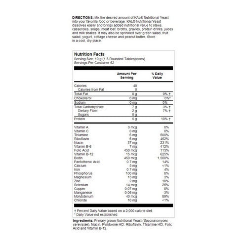 {"id":2588371877973,"title":"Kal, Nutritional Yeast Flakes, 22 oz","handle":"nutritional-yeast-flakes-64850","description":"\u003cstrong\u003eProduct Description\u003c\/strong\u003e\u003cbr\u003e\u003cbr\u003e \u003cul\u003e\n\u003cli\u003eFortified, Premium Unsweetened\u003c\/li\u003e\n\u003cli\u003eGluten Free, Vegan\u003c\/li\u003e\n\u003cli\u003eWonderful Nutty Flavor\u003c\/li\u003e\n\u003cli\u003eNon-GMO\u003c\/li\u003e\n\u003c\/ul\u003e\n \u003cbr\u003e\u003cbr\u003e\u003cstrong\u003eProduct Benefits\u003c\/strong\u003e\u003cbr\u003e\n\t\u003cbr\u003e Nutritional Yeast Flakes are a primary grown product, grown on molasses, for a nutty, roasted flavor that isn?t bitter like traditional yeast products. This product contains no artificial sweeteners or genetically modified organisms. Low in fat and sodium with added B vitamins, mixing in some yeast flakes can help you meet your nutrition goals. \u003cbr\u003e\u003cbr\u003e\u003cstrong\u003eIngredients\u003c\/strong\u003e\u003cbr\u003e\u003cbr\u003e \u003cdiv class=\"prodSupCls\"\u003e\n\u003ctable width=\"100%\" border=\"1\" cellspacing=\"0\" cellpadding=\"3\"\u003e\n\u003ctr\u003e\n \u003ctd colspan=\"3\"\u003e\n\u003cp\u003e\u003cstrong style=\"font-size:16px;\"\u003eSupplement Facts\u003c\/strong\u003e\u003cstrong\u003e\u003cspan style=\"float: right\"\u003eServing Size: \n 10 g (1.5 Rounded Tablespoons)\u003c\/span\u003e\u003c\/strong\u003e\u003c\/p\u003e\n \u003cp\u003e \u003c\/p\u003e\n\u003c\/td\u003e\n\u003c\/tr\u003e\n \u003ctr\u003e\n \u003ctd width=\"49%\" style=\"height: 27px\"\u003e\u003c\/td\u003e\n \u003ctd width=\"24%\" style=\"height: 27px\"\u003e\u003cstrong\u003eAmount Per Serving \u003c\/strong\u003e\u003c\/td\u003e\n \u003ctd width=\"27%\" style=\"height: 27px\"\u003e\u003cstrong\u003e% Daily Value\u003c\/strong\u003e\u003c\/td\u003e\n \u003c\/tr\u003e\n \u003ctr\u003e\n \u003ctd style=\"height: 27px\"\u003eCalories\u003c\/td\u003e\n \u003ctd style=\"height: 27px\"\u003e40\u003c\/td\u003e\n \u003ctd style=\"height: 27px\"\u003e \u003c\/td\u003e\n \u003c\/tr\u003e\n \u003ctr\u003e\n \u003ctd style=\"height: 27px\"\u003eCalories from Fat\u003c\/td\u003e\n \u003ctd style=\"height: 27px\"\u003e0\u003c\/td\u003e\n \u003ctd style=\"height: 27px\"\u003e \u003c\/td\u003e\n \u003c\/tr\u003e\n \u003ctr\u003e\n \u003ctd style=\"height: 27px\"\u003eTotal Fat\u003c\/td\u003e\n \u003ctd style=\"height: 27px\"\u003e0 g\u003c\/td\u003e\n \u003ctd style=\"height: 27px\"\u003e0% †\u003c\/td\u003e\n \u003c\/tr\u003e\n \u003ctr\u003e\n \u003ctd style=\"height: 27px\"\u003eCholesterol\u003c\/td\u003e\n \u003ctd style=\"height: 27px\"\u003e0 mg\u003c\/td\u003e\n \u003ctd style=\"height: 27px\"\u003e0%*\u003c\/td\u003e\n \u003c\/tr\u003e\n \u003ctr\u003e\n \u003ctd style=\"height: 27px\"\u003eSodium\u003c\/td\u003e\n \u003ctd style=\"height: 27px\"\u003e0 mg\u003c\/td\u003e\n \u003ctd style=\"height: 27px\"\u003e0%\u003c\/td\u003e\n \u003c\/tr\u003e\n \u003ctr\u003e\n \u003ctd style=\"height: 27px\"\u003eTotal Carbohydrate\u003c\/td\u003e\n \u003ctd style=\"height: 27px\"\u003e7 g\u003c\/td\u003e\n \u003ctd style=\"height: 27px\"\u003e3% †\u003c\/td\u003e\n \u003c\/tr\u003e\n \u003ctr\u003e\n \u003ctd style=\"height: 27px\"\u003eDietary Fiber\u003c\/td\u003e\n \u003ctd style=\"height: 27px\"\u003e2 g\u003c\/td\u003e\n \u003ctd style=\"height: 27px\"\u003e7% †\u003c\/td\u003e\n \u003c\/tr\u003e\n \u003ctr\u003e\n \u003ctd style=\"height: 27px\"\u003eSugars\u003c\/td\u003e\n \u003ctd style=\"height: 27px\"\u003e0 g\u003c\/td\u003e\n \u003ctd style=\"height: 27px\"\u003e \u003c\/td\u003e\n \u003c\/tr\u003e\n \u003ctr\u003e\n \u003ctd style=\"height: 27px\"\u003eProtein\u003c\/td\u003e\n \u003ctd style=\"height: 27px\"\u003e5 g\u003c\/td\u003e\n \u003ctd style=\"height: 27px\"\u003e10% †\u003c\/td\u003e\n \u003c\/tr\u003e\n \u003ctr\u003e\n \u003ctd style=\"height: 27px\"\u003eVitamin A\u003c\/td\u003e\n \u003ctd style=\"height: 27px\"\u003e0 mcg\u003c\/td\u003e\n \u003ctd style=\"height: 27px\"\u003e0%\u003c\/td\u003e\n \u003c\/tr\u003e\n \u003ctr\u003e\n \u003ctd style=\"height: 27px\"\u003eVitamin C\u003c\/td\u003e\n \u003ctd style=\"height: 27px\"\u003e0 mg\u003c\/td\u003e\n \u003ctd style=\"height: 27px\"\u003e0%\u003c\/td\u003e\n \u003c\/tr\u003e\n \u003ctr\u003e\n \u003ctd style=\"height: 27px\"\u003eThiamine\u003c\/td\u003e\n \u003ctd style=\"height: 27px\"\u003e6 mg\u003c\/td\u003e\n \u003ctd style=\"height: 27px\"\u003e500% \u003c\/td\u003e\n \u003c\/tr\u003e\n \u003ctr\u003e\n \u003ctd style=\"height: 27px\"\u003eRiboflavin\u003c\/td\u003e\n \u003ctd style=\"height: 27px\"\u003e6 mg\u003c\/td\u003e\n \u003ctd style=\"height: 27px\"\u003e462%\u003c\/td\u003e\n \u003c\/tr\u003e\n \u003ctr\u003e\n \u003ctd style=\"height: 27px\"\u003eNiacin\u003c\/td\u003e\n \u003ctd style=\"height: 27px\"\u003e37 mg\u003c\/td\u003e\n \u003ctd style=\"height: 27px\"\u003e231%\u003c\/td\u003e\n \u003c\/tr\u003e\n \u003ctr\u003e\n \u003ctd style=\"height: 27px\"\u003eVitamin B-6\u003c\/td\u003e\n \u003ctd style=\"height: 27px\"\u003e7 mg\u003c\/td\u003e\n \u003ctd style=\"height: 27px\"\u003e412%\u003c\/td\u003e\n \u003c\/tr\u003e\n \u003ctr\u003e\n \u003ctd style=\"height: 27px\"\u003eFolic Acid\u003c\/td\u003e\n \u003ctd style=\"height: 27px\"\u003e450 mcg\u003c\/td\u003e\n \u003ctd style=\"height: 27px\"\u003e113%\u003c\/td\u003e\n \u003c\/tr\u003e\n \u003ctr\u003e\n \u003ctd style=\"height: 27px\"\u003eVitamin B-12\u003c\/td\u003e\n \u003ctd style=\"height: 27px\"\u003e15 mcg\u003c\/td\u003e\n \u003ctd style=\"height: 27px\"\u003e625%\u003c\/td\u003e\n \u003c\/tr\u003e\n \u003ctr\u003e\n \u003ctd style=\"height: 27px\"\u003eBiotin\u003c\/td\u003e\n \u003ctd style=\"height: 27px\"\u003e450 mcg\u003c\/td\u003e\n \u003ctd style=\"height: 27px\"\u003e1,500%\u003c\/td\u003e\n \u003c\/tr\u003e\n \u003ctr\u003e\n \u003ctd style=\"height: 27px\"\u003ePantothenic Acid\u003c\/td\u003e\n \u003ctd style=\"height: 27px\"\u003e0.7 mg\u003c\/td\u003e\n 