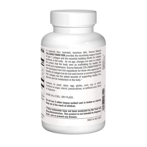 To replenish firm, hydrated, luxurious skin, Source Naturals Collagen From Fish provides the nourishing support benefits of type 1 collagen and the essential building blocks for collagen synthesis in the body.Source Naturals Collagen From Fish was developed from fish ingredients for those who appreciate the benefits of collagen but do not want bovine or porcine ingredients. Fish collagen has the added benefits of supporting healthy liver, glucose and fat metabolism in the body.