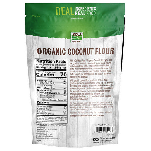 Suggested Usage: With Organic Coconut Flour you'll use far less than grain-based flours, approximately 1/4 to 1/3 the amount of regular flour called for. You'll also need to increase the amount of liquid used, which can be done by increasing the amount of eggs or egg-substitute. With its unique characteristics we recommend using recipes specifically developed for Coconut Flour, which you can find at: Now real food.