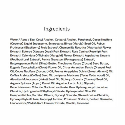 | Ingredients: Aqua (water/eau), cetearyl alcohol, glycerin, stearalkonium chloride, behentrimonium chloride, cetearyl glucoside, glyceryl stearate, sorbitan olivate, cocos nucifera (coconut) oil, sclerocarya bierra (marula) seed oil, aleurites moluccanna (kukui) seed oil, butyrospermum parkii (shea) butter, cocos nucifera (coconut) water, argania spinosa (argan) kernel oil*, theobroma cacao (cocoa) seed butter, euterpe oleracea (acai) fruit extract*, rubus fruticosus (blackberry) fruit extract*, punica granatum (pomegranate) extract*, rosa canina (rosehip) fruit extract*, calendula officinalis (calendula) flower extract*, aspalathus linearis (rooibos) leaf extract*, chamomilla recutita (matricaria) flower extract*, guar hydroxypropyltrimonium chloride, arginine, sodium levulinate, prunus amygdalus dulcis (sweet almond) oil, vanillin, citrus aurantium dulcis (orange) peel oil, juniperus mexicana (cedarwood) oil, dipteryx odorata (tonka bean) seed oil, coffea arabica (coffee) seed oil, eugenia caryophyllus (clove) flower oil, lactic acid, tocopheryl acetate, cetyl alcohol, potassium sorbate. *Organic ingredient. |