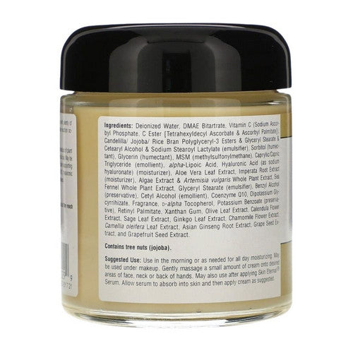 | Deionized Water, DMAE Bitartrate, Vitamin C (Sodium Ascorbyl Phosphate, C Ester [Tetrahexyldecyl Ascorbate & Ascorbyl Palmitate]), Candelilla/ Jojoba/ Rice Bran Polyglyceryl-3 Esters & Glyceryl Stearate & Cetearyl Alcohol & Sodium Stearoyl Lactylate (emulsifier), Sorbitol (humectant), Glycerin (humectant), MSM (methylsulfonylmethane), Caprylic/Capric Triglyceride (emollient), alpha- Lipoic Acid, Hyaluronic Acid (as sodium hyaluronate) (moisturizer), Aloe Vera Leaf Extract, Imperata Root Extract (moisturizer), Algae Extract & Artemisia vulgaris Whole Plant Extract, Sea Fennel Whole Plant Extract, Glyceryl Stearate (emulsifier), Benzyl Alcohol (preservative), Cetyl Alcohol (emollient), Coenzyme Q10, Dipotassium Glycyrrihizate, Fragrance, d-alpha Tocopherol, Potassium Benzoate (preservative), Retinyl Palmitate, Xanthan Gum, Olive Leaf Extract, Calendula Flower Extract, Sage Leaf Extract, Ginkgo Leaf Extract, Chamomile Flower Extract, Camellia oleifera Leaf Extract, Asian Ginseng Root Extract, Grape Seed Extract, and Grapefruit Seed Extract. | ||