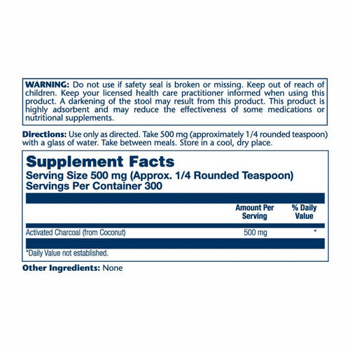 Do not use if safety seal is broken or missing. Keep out of reach of children. Keep your licensed health care practitioner informed when using this product. A darkening of the stool may result from this product. This product is highly absorbent and may reduce the effectiveness of some medications or nutritional supplements.