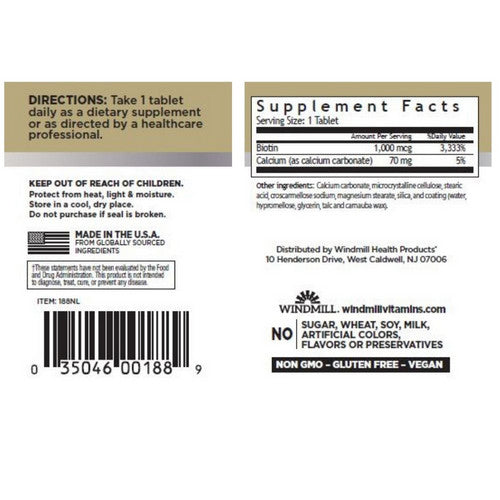 This Biotin formula provides you with 1,000 mcg per tablet. An essential B vitamin which aids in cell growth, fatty acid production, the metabolism of carbohydrates, fats, and proteins, and in the utilization of other B-complex vitamins.