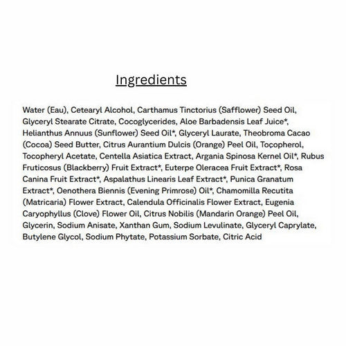 | Other Ingredients: Water (aqua), cetearyl alcohol, glyceryl stearate citrate, carthamus tinctorius (safflower) seed oil, theobroma cacao (cocoa) seed butter, cocos nucifera (coconut) oil, cocoglycerides, glycerin, helianthus annuus (sunflower) seed oil, glyceryl laurate, citrus aurantium dulcis (orange) peel oil, olea europaea (olive) fruit oil, potassium sorbate, citrus nobilis (mandarin orange) peel oil, glyceryl caprylate, tocopheryl acetate, sodium levulinate, oenothera biennis (evening primrose) oil, alcohol, citric acid, calendula officinalis flower extract, tocopherol, sodium phytate, glycine soja oil, aloe barbadensis leaf juice, eugenia caryophyllus (clove) leaf oil, rubus fruticosus (blackberry) fruit extract, rosa canina (rosehip) fruit extract, punica granatum extract, euterpe oleracea fruit extract, chamomilla recutita (matricaria) flower extract, aspalathus linearis (rooibos) leaf extract, argania spinosa (argan) kernel oil, marrubium vulgare meristem cell culture, echinacea angustifolia extract, centella asiatica leaf (cica) extract, xanthan gum. |