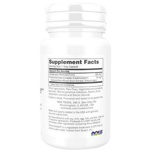 Now Solutions Glutathione Skin Brightener is a combination of two validated ingredients that nourish from within to give skin a healthy glow.* First, glutathione helps to maintain normal expression of skin pigments, which can result in a bright and even skin tone, and helps to maintain skin?s natural moisture content and elasticity.* This product also features Ceramosides, a plant extract highly concentrated in phytoceramides, which has been shown to moisturize skin from within and to maintain youthful skin appearance.*
