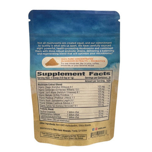 Eidon is introducing a new, natural supplement using a blend of Mushrooms and Probiotics to support optimal gut health. We've created a unique, synergistic blend that harnesses the power of eight of the most studied mushrooms that have been traditionally used for centuries: Reishi, Chaga, Lion's Mane, Maitake, Turkey Tail, Shiitake, Phellinus and Cordyceps. These fungi powerhouses are major factors in a well-functioning gut biome.