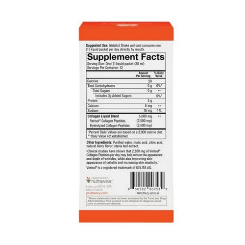 Collagen is the most abundant protein in the body and helps give structure to skin, hair and nails. As you get older, bodys natural ability to product collagen will decrease over time leading to visible signs of aging. Collagen liquid supplies of hydrolyzed collagen (per single serving) to help combat age related collagen loss.*