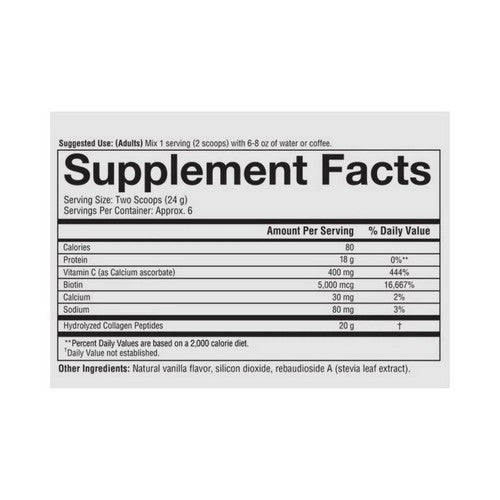 Hair Skin And Nails Vitamins. Dietary Supplement. Highly Absorbable Hydrolyzed Collagen Peptides. Replenishes Collagen. Revitalizes Skin, Hair & Nails. Fights the Effects Of Aging. Supports Tendons And Ligaments. No Binders Or Fillers. Convenient Powder Format With a Great Tasting Natural Vanilla Flavor.