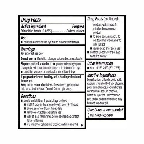 Active Ingredients: Brimonidine Tartrate 0.025%. Inactive Ingredients: Benzalkonium Chloride; Boric Acid; Calcium Chloride Dihydrate; Glycerin; Potassium Chloride; Sodium Borate Decahydrate; Sodium Chloride; Water for Injection; Hydrochloric Acid and/or Sodium Hydroxide May be Used to Adjust pH. |