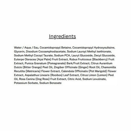| Ingredients: Water/eau, aloe barbadensis (aloe vera) leaf juice*, euterpe oleracea (acai) fruit extract*, rubus fruticosus (blackberry) fruit extract*, rosa canina (rosehips) fruit extract*, punica granatum (pomegranate) fruit extract*, calendula officinalis (calendula) flower extract*, matricaria recutita (chamomile) flower extract*, aspalathus linearis (rooibos) leaf extract*, sodium cocoyl isethionate, coco hydroxysultane, sodium methyl cocoyl taurate, decyl polyglucoside, lauryl glucoside, disodium cocoampho- diacetate, potassium olivoyl pca, vegetable glycerin, citrus limon (lemon) essential oil, glucono delta lactone, potassium sorbate, chlorella vulgaris extract (chlorella). *Organic ingredient / *ingr?dient biologique. |