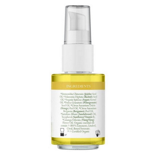 | Ingredients: Organic jojoba oil, organic baobab oil, organic argan oil, organic pomegranate oil, organic orange oil, organic bergamot oil, organic sandalwood oil, sunflower Vitamin E & organic ylang ylang flower oil. |
